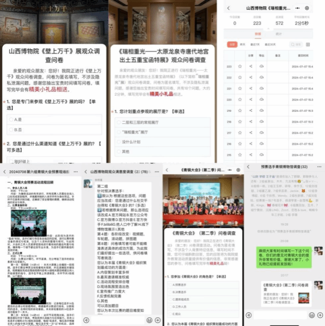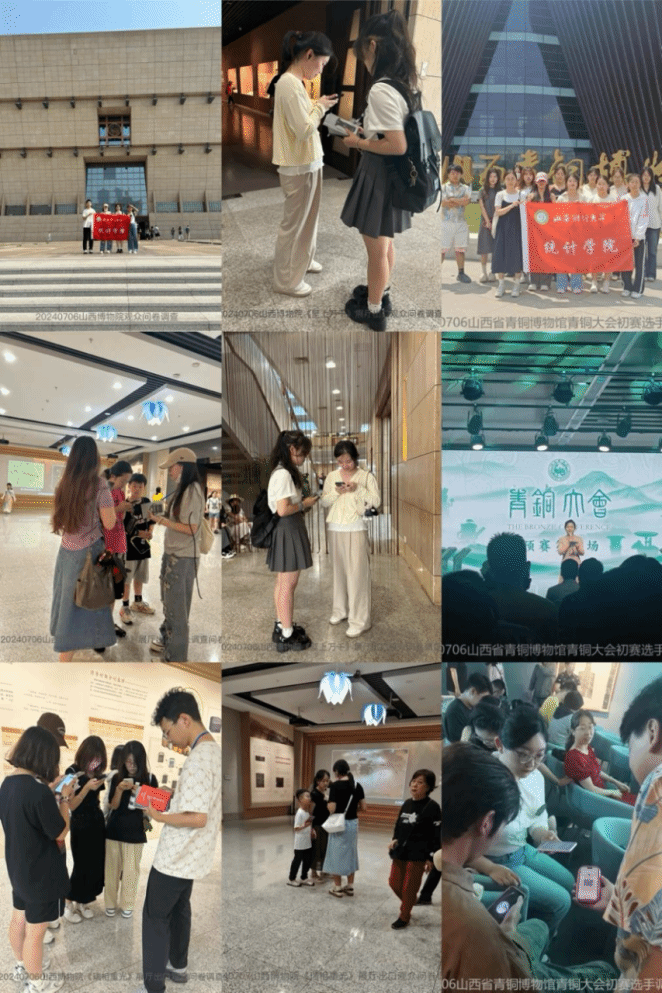 各小组在领到任务后,迅速进入状态,展现出高度的责任感和团队协作精神。4组和13组于7月4日率先启动了对“瑞相重光展”与“壁上万千展”观众满意度调查方案设计工作,并于6日、7日成功在山西博物院实施了问卷调查,历时2天,“瑞相重光展”收集了223份调查问卷,“壁上万千展”收集了283份调查分卷。7月6日2、7、12和6组,启动了“青铜大会第二季”选手调查工作,通过现场观摩预赛、撰写流程总结和观后心得,设计和修改问卷,并对参加第一场预赛的选手进行了问卷调查。而1、9、8、3组则正紧锣密鼓地设计着针对“秦晋展”和“古希腊展”展前调查及“晋魂基本陈列展”展品说明偏好的问卷,计划于7月13-14日开展实地调查。此外,10组专注分析线上宣传效果,正积极与山西博物院对接获取新媒体后台数据;5组和11组则致力于调查方案设计,力求精准捕捉活动参加者心声。作为整个实践活动的“幕后英雄”,14组则负责整合各组图片、数据、心得,学习word文档技巧,为最终形成高质量的总报告奠定坚实基础。