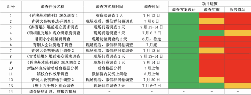 组织,项目负责人张帅老师负责指导。74名学生被分为14个小组,每组4-6人,设组长一名,项目共有9个调查任务,包括晋魂基本陈列展观众调查、临展观众调查、教育活动参加者调查以及新媒体宣传活动后台数据分析等。14个小组将分期分批完成9个调查任务,最终将撰写8个子报告和1个总报告。